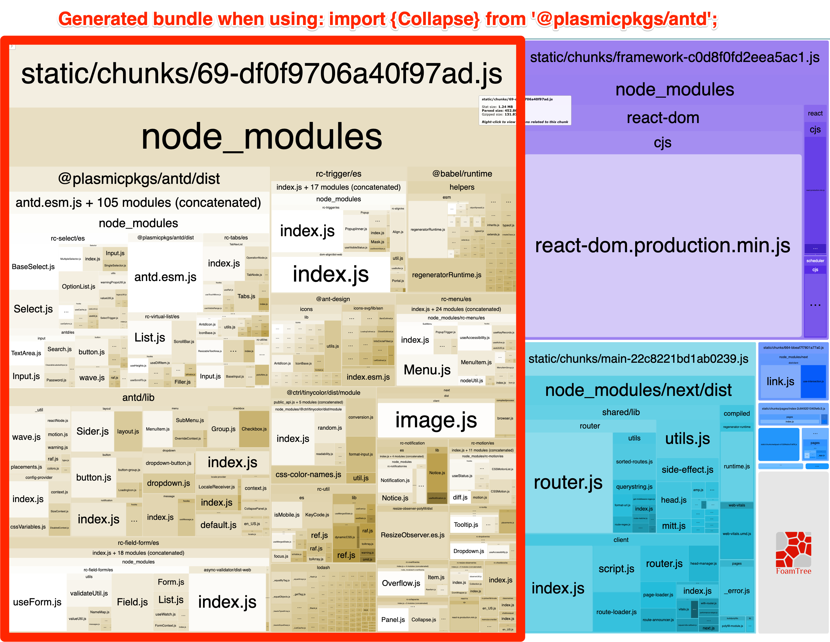 started seeing our Next.js bundles increase considerably in size after we imported the Antd package in our Plasmic project. Dug a little deeper into it and it seems that just importing a single object from @plasmicpkgs/antd results in a huge bundle with all antd dependencies included, along with some rc- and lodash helpers (treemap screenshot included)