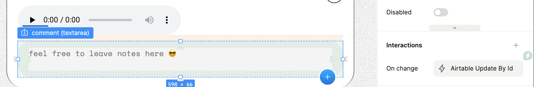 I added an “On change” interaction to the textarea to “Update row” in Airtable, but I’m not sure how to call the value from the actual textarea as the data to use for the update. I hope I’m explaining well what I mean.