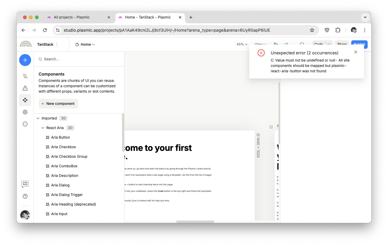 C: Value must not be undefined or null- All site components should be mapped but plasmic- react-aria -button was not found