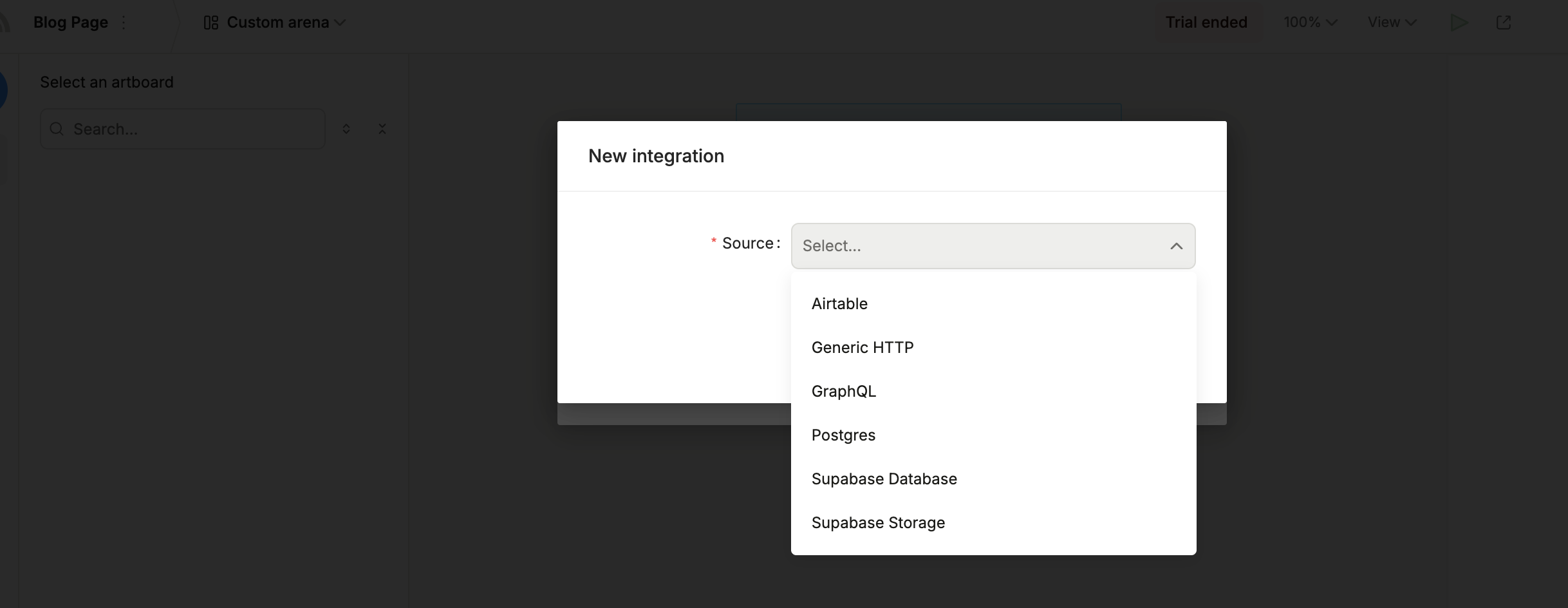 - Notice that only external integrations are available, and the Plasmic CMS does not appear as an option.