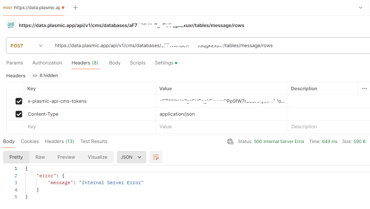 I want to create item into Plasmic CMS using API but got internal server error. Getting item using API has no issue.