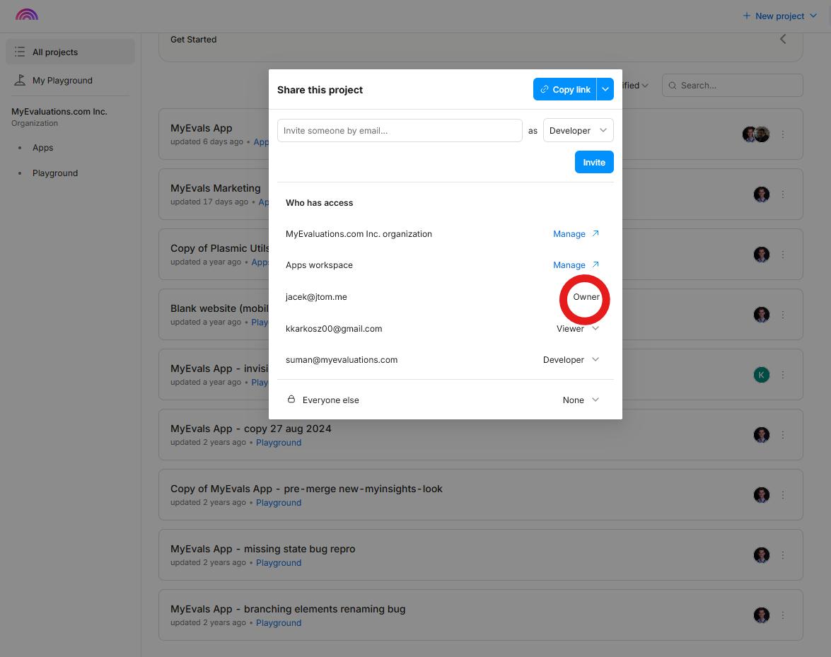 Need to change the owner on all projects. They are listed under a developer jacek@jtom.me and should be transferred to david@myevaluations.com