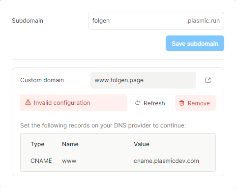 I had vercel dns enabled which allows me to create and to point to apps with subdomains easy, I just wanted to publish a static page, which seems it shouldn’t need to pass through vercel, but that I would still benefit in the future if I’d wanted to move it into code. Plasmic subdomain works fine, but then if I try to add CNAME that points to plasmic, It would error as an invalid config If I added such CNAME in vercel dns; since my domain came from another provider (that is, I did not transfer it to vercel (just pointed to their IP address when I setup vercel DNS) I tried adding the CNAME there, then it kind of worked, but it complained about certificates, and then if you skip that, it goes to a non existing deployment (message from vercel). Then tried aliasing to the plasmic.run subdomain, and finally fully removed my domain from vercel. Nothing changed the 404 with the non existing deployment message.