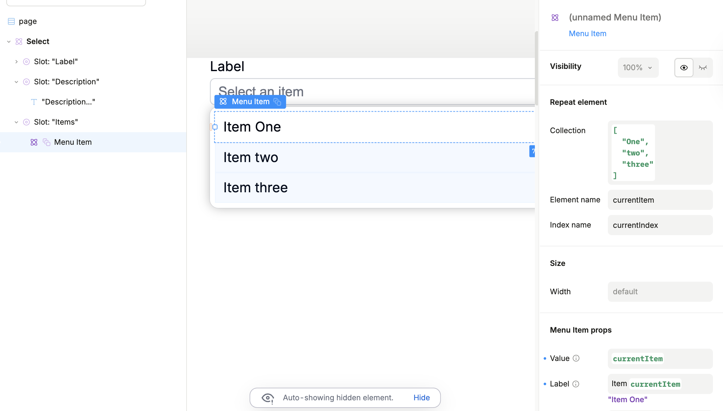 How can I specify which column of the data query should be used to populate the user-visible items on the Select component?