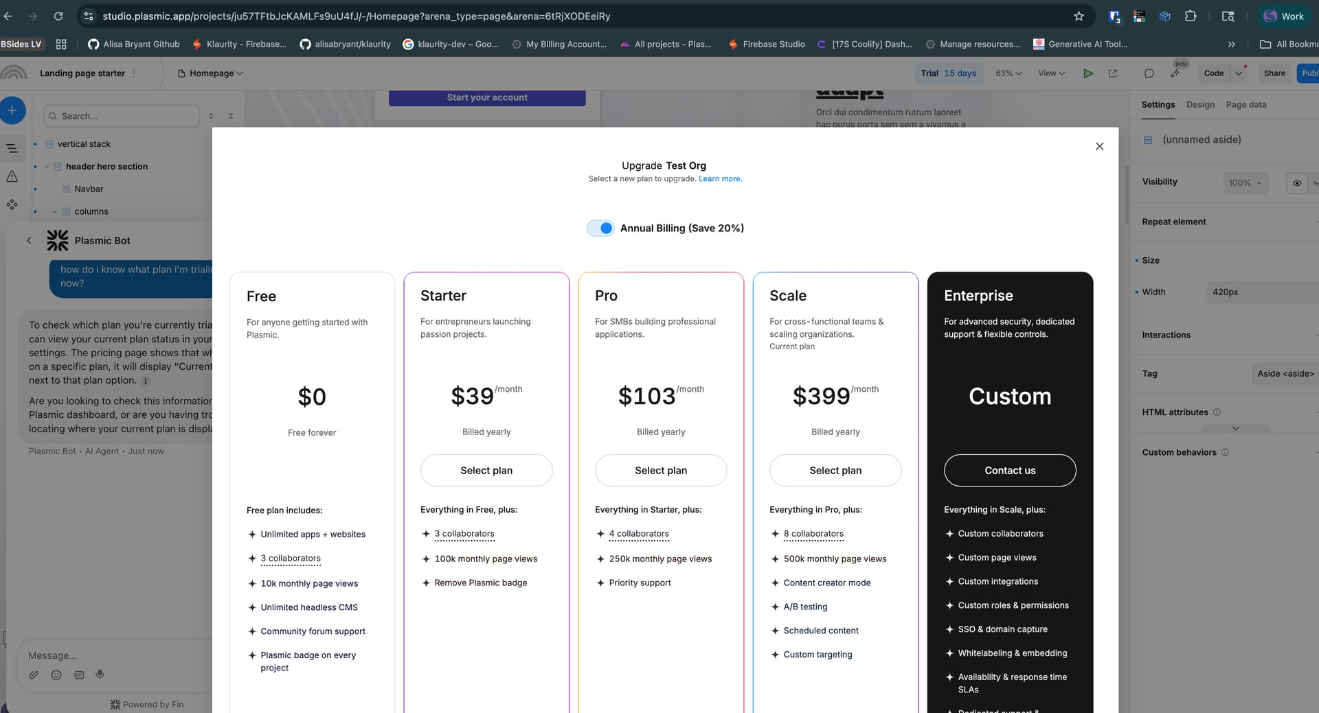 - View the five plan options (Free, Starter, Pro, Scale, Enterprise)