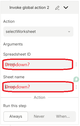 Because of the dynamic of the spreadsheets, I want to be able to select spreadsheet Id from a dropdown list in plasmic studio and then its respective worksheets will appeared in the next dropdown. Once a specific worksheet, all its header rows will be shown as inputs where I can dynamically entered values.