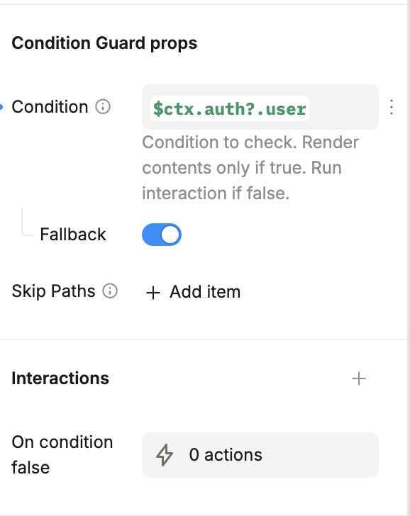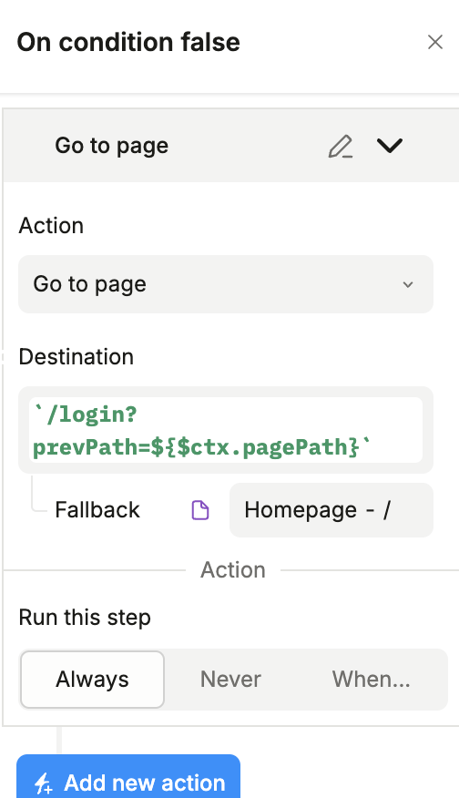 Then, you need to handle the case when the condition is equal to false – meaning that the user is not logged in. In order to do that - create an interaction “On condition false” with a “Go to page” action.