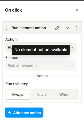 I just reported an issue with the element action components, who are registering but not exposing the actions (functions). I created my component and copy/paste the documentation website but didn’t work. They don’t now appear in Run element action select (is deactivated). I will appreciate any help, thanks in advance!