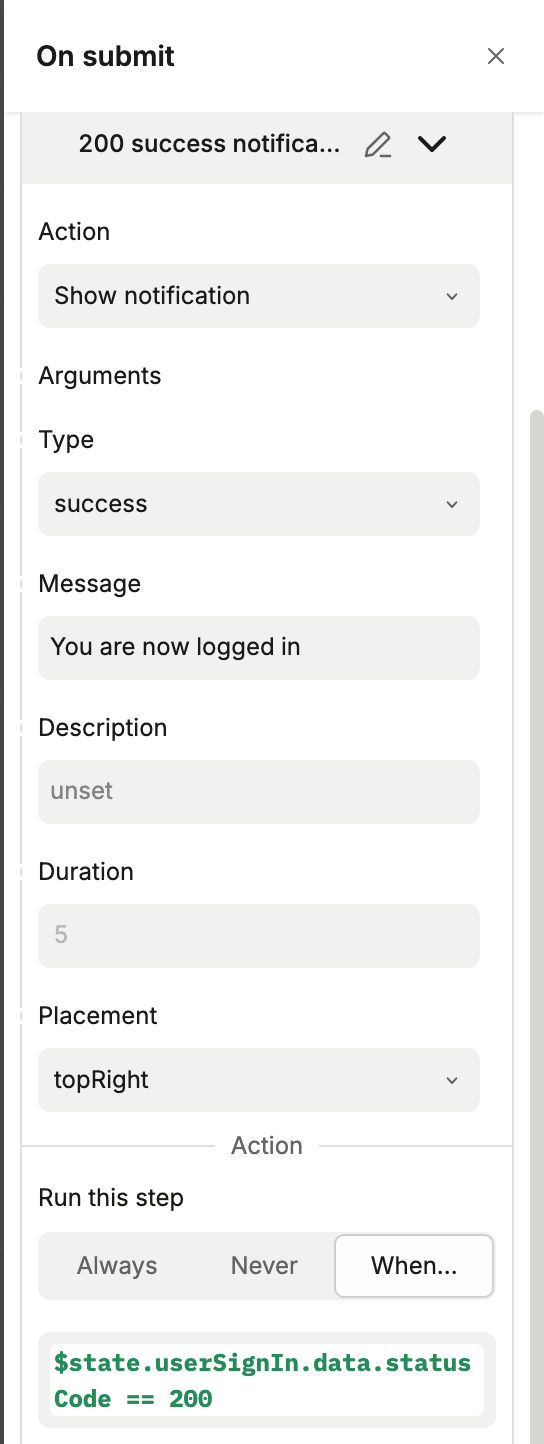 Here is my notification setup for this success with a when condition $state.userSignIn.data.statusCode == 200