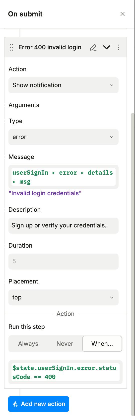 Even though I’ve set up the “when” conditions properly (i.e., $state.userSignIn.error.statusCode == 400 for errors and $state.userSignIn.data.statusCode == 200 for success), the behavior changes depending on whether I place the error notification before the success notification, or vice versa.