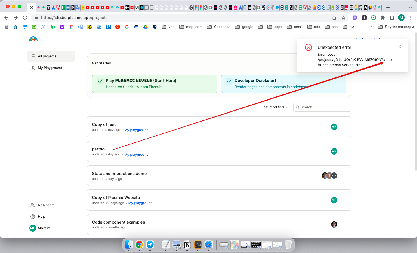 Unexpected error Error: post /projects/gD1prUQrfhKdWVtM6ZG9YV/clone failed: Internal Server Error