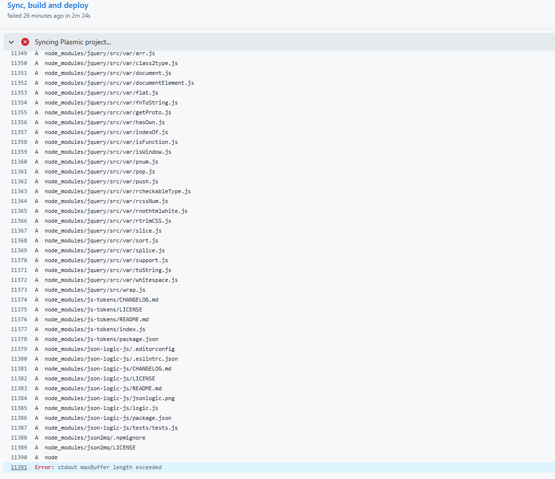When publishing the Plasmic Project to a private github repo as codgen next.js I get an error on the plasmic sync step while it’s installing packages, it seems to vary which package it breaks on. The error is “stdout maxBuffer length exceeded”