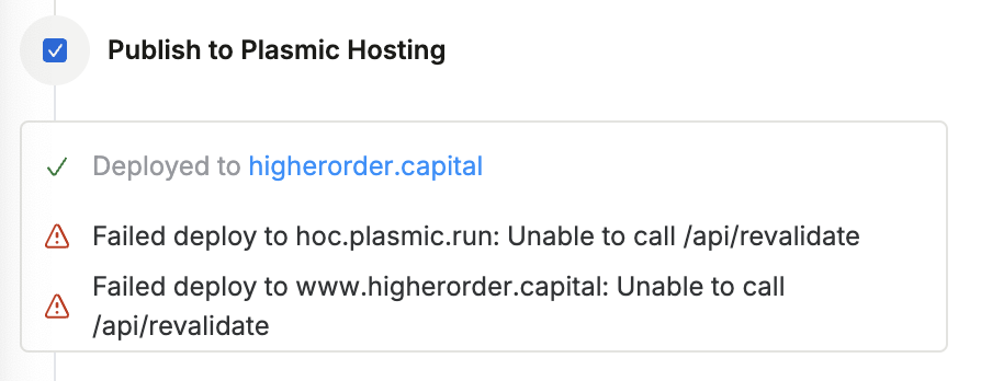“Failed deploy to hoc.plasmic.run: Unable to call /api/revalidate”