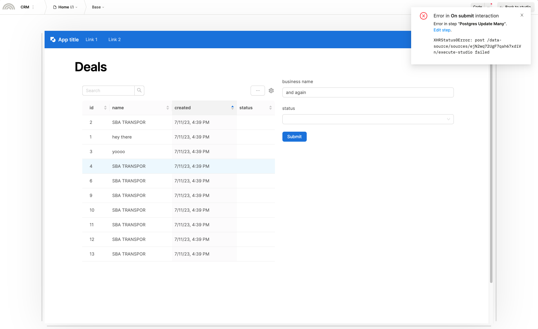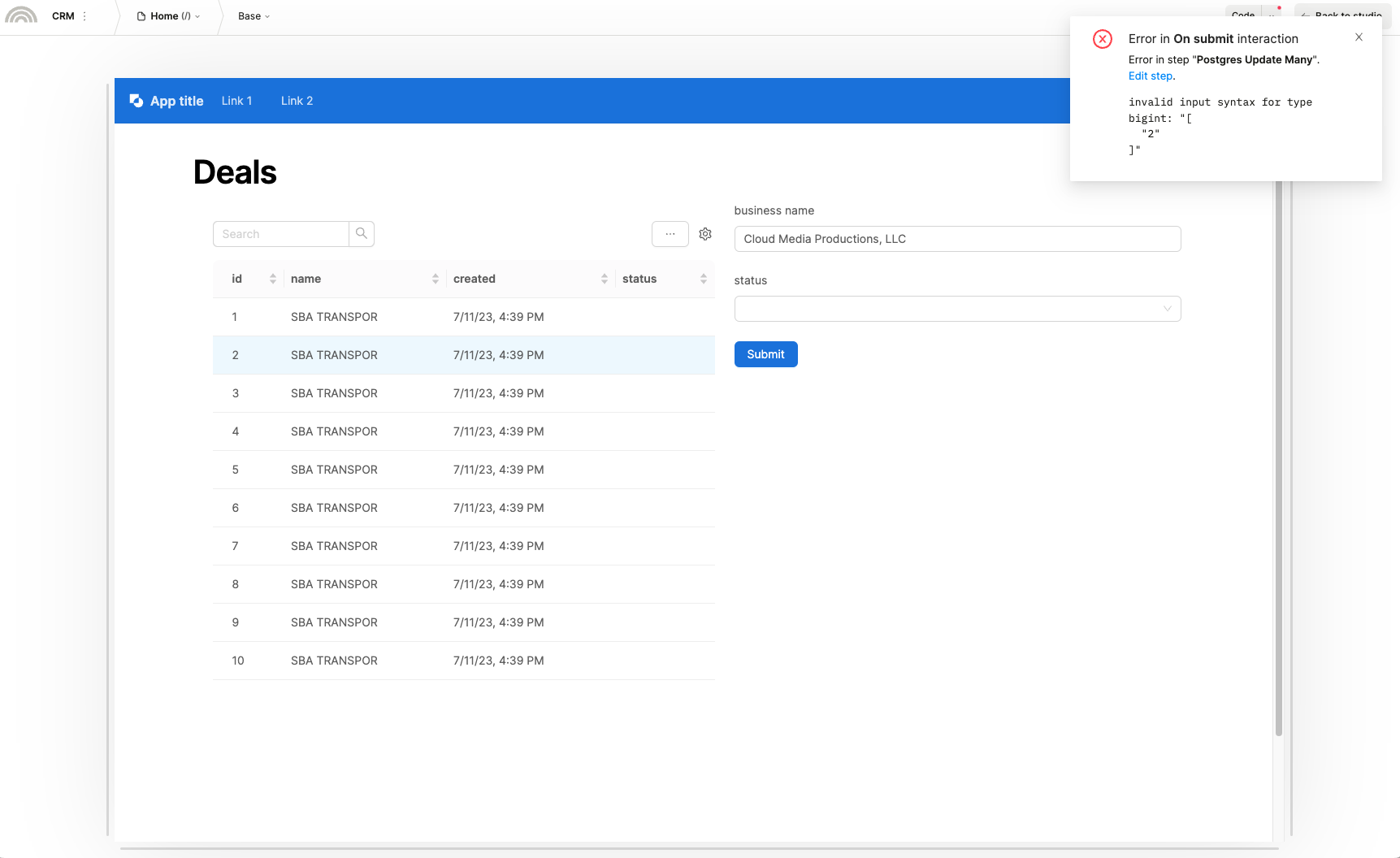 Thanks for looking into this. The data picker stops at selectedRow (doesn’t break out further into the row’s fields), so I typed $state.allDeals.selectedRow.id – but it doesn’t work properly when testing. One time it updated the values as intended, twice it returned the attached error, and now it just does nothing on submit.