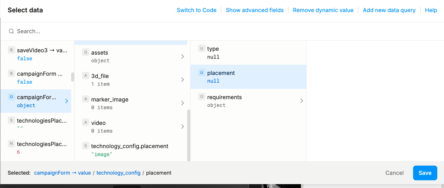 4.- trying to use a component inside the form field called “currentIndex” where its value is the $state.buttonconfig.find(u => u.type_id === currentItem.type_id), this is the closest i’ve been however all components expect a string value, when the value is an object i get a react error (even though the form field it does get the value), if i could find a form component that its value is an object or an array that could work.