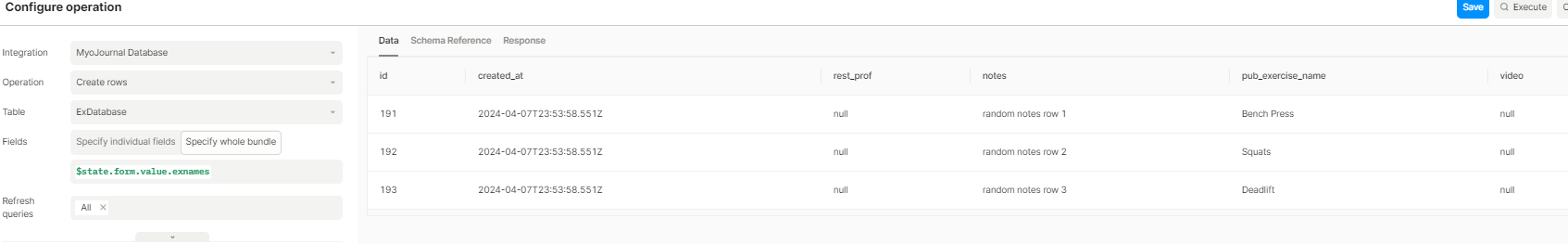 When specifying just the “exnames” values and executing inside plasmic, it creates the rows like it I would expect (in Supabase as well)