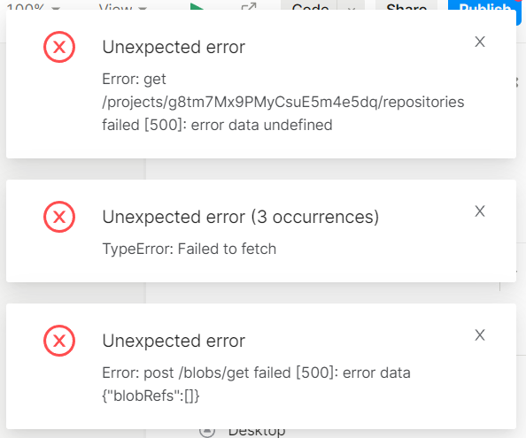 Seeing this error: “Unexpected error Error: get /projects/g8tm7Mx9PMyCsuE5m4e5dq failed [500]: error data {}” - Studio stuck at the animating bars.