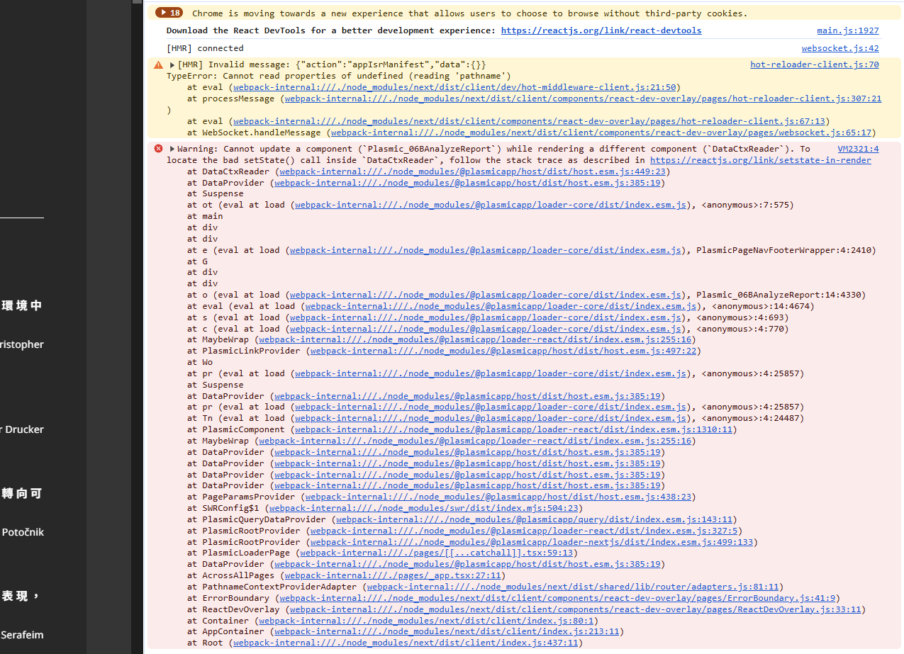 VM2321:4 Warning: Cannot update a component (`Plasmic_06BAnalyzeReport`) while rendering a different component (`DataCtxReader`). To locate the bad setState() call inside `DataCtxReader`, follow the stack trace as described in https://reactjs.org/link/setstate-in-render