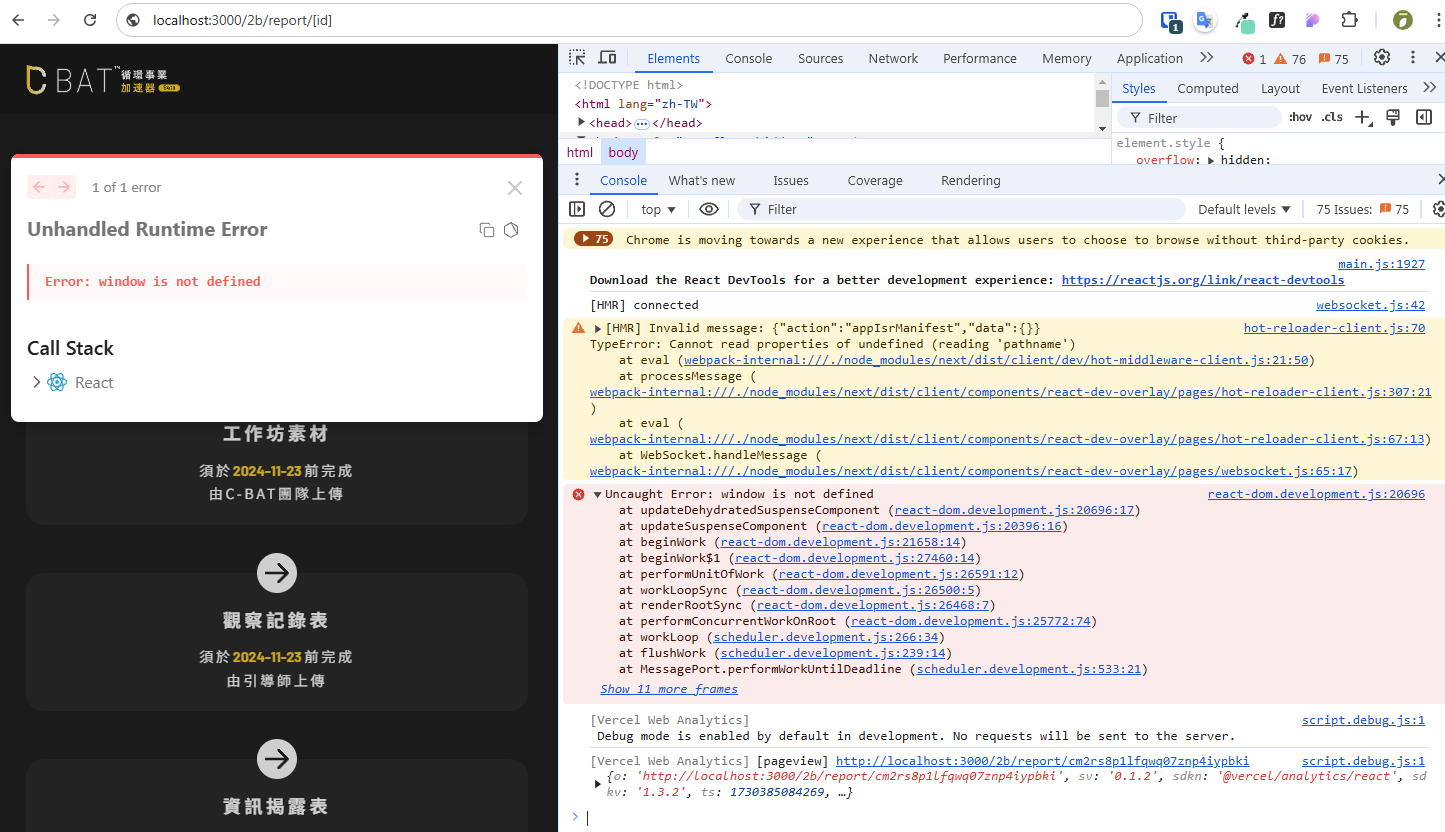 So, I’m not getting a “window is not defined” React error on the screen in localhost anymore, but I’m still seeing the message in the terminal devlog (a), and the other error message in chrome localhost devlog (b).