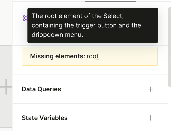 certain elements in Select, Checkbox, and Switch are “important” because that’s where we inject accessibility and interactivity (you’ll see that those elements have a little “feather” next to them, and when they’re missing, you see a little warning sign like in the screenshot). We probably could’ve been more resilient in this case since we should always know where the “root” element is…