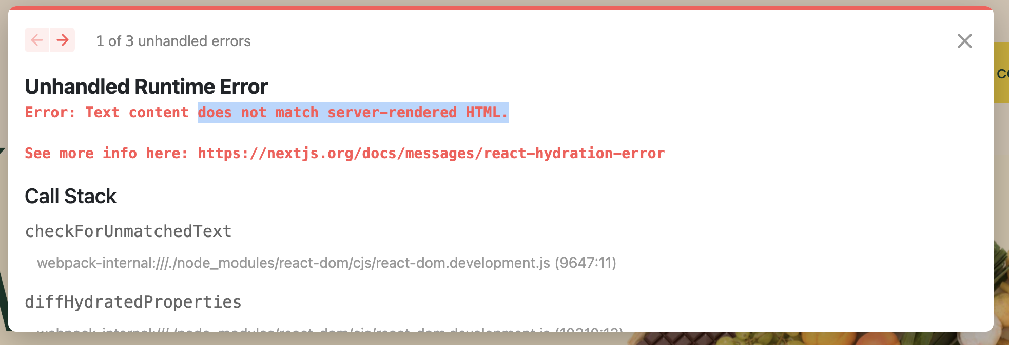 During the hydration process Next.js checks the server side content with the client content that’s is generated so that each element is properly hydrated knowing their server side and client side version. When you code runs in server side and when is going to hydrate you probably has different values for “Locale” which makes the content different thus triggering an error.