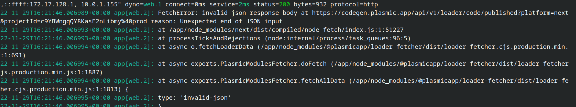 @valid_chipmunk We’re looking now - are you still seeing that error when making requests to that endpoint? https://codegen.plasmic.app/app/v1/loader/code/published?platform=next&projectId=c9YBWngqQY8KasE2nLibmy
