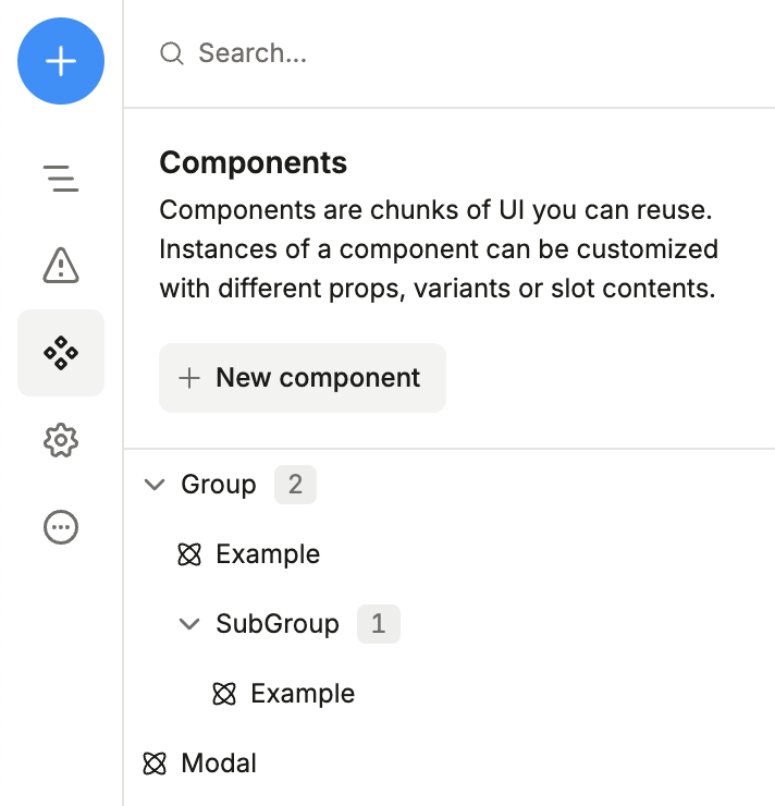 To create folders and nest components, just rename your components using the / separator. For example, naming a component “Folder/ComponentName” will place it inside the “Folder”.