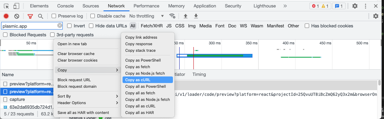 Can you right-click the network request to the /preview endpoint and paste it to me?