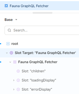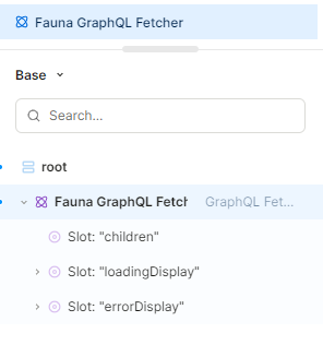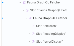I have created based on the “GraphQL Fetcher” component, an own “Fauna GraphQL Fetcher” component, that has already the URL and headers set. (Screenshot 1) But If I use it, I can’t access the Slots inside the “Fauna GraphQL Fetcher” Component. (Screenshot 2)