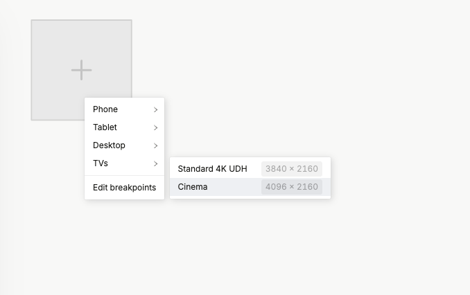 For example, in your project you’d need to add a screen size of 4000+ px width (the Cinema preset) to create a Base variant artboard on a page: