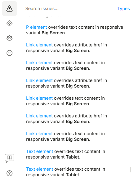 I’ve added a Cinema screen size so your project now has a Base artboard. I also completed the bulk transfer of varianted changes into Base. At this point, the Issues panel should only show a few remaining errors that weren’t picked up by the transfer.