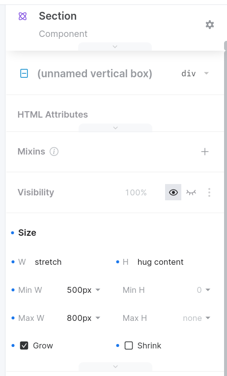 at the end of the video, I observe, that the section component is still being rendered to the former min-width of 500px. Even after I set a fixed width of 800px and synced it. And after restarting the app completely.