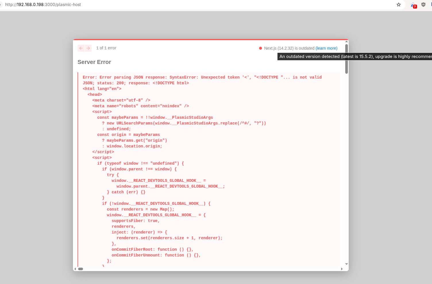 I do have a same error using this example from plasmic repo but trying to provide my working self-hosted domain as a backend server for plasmic plasmic.my.domain insead of studio.plasmic.app:
