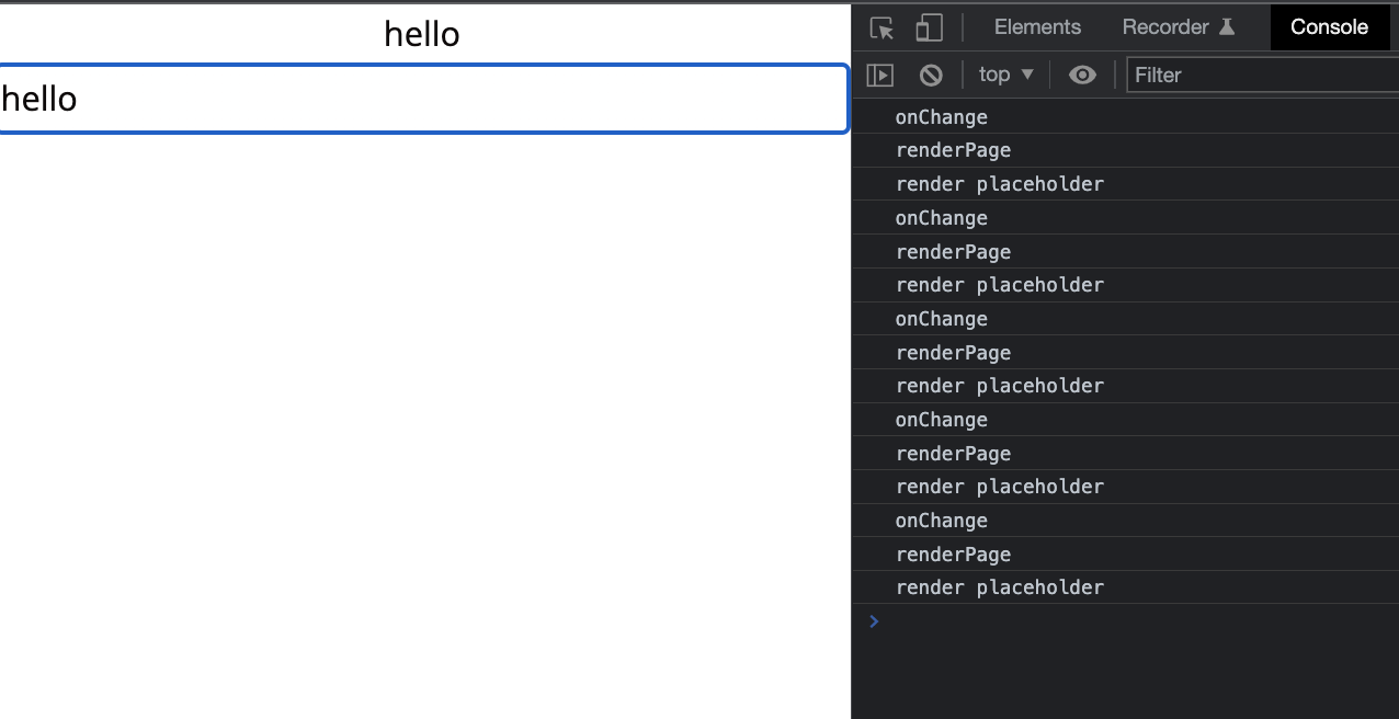 I’ve got the following page component, with a dummy placeholder div and a textInput element. Whenever there is a new input, even the placeholder component is rerendering. I experience slowness for larger pages and this is probably one of the reasons.