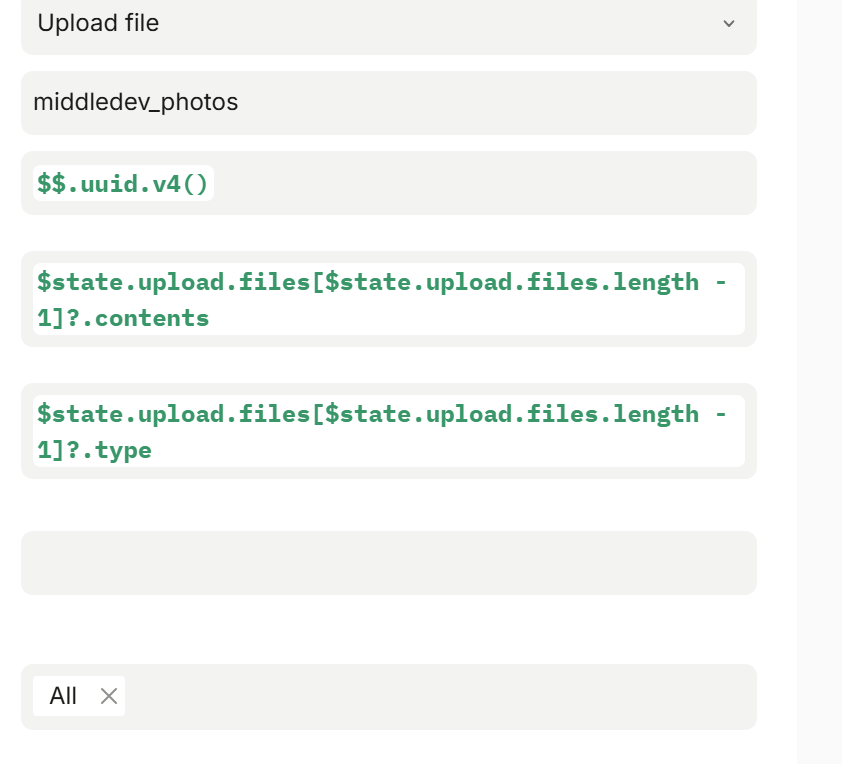 Steps to reproduce: 1. Create Supabase Storage integration 2. Add button for upload