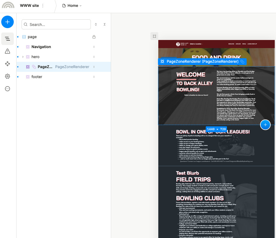 Each page is really only consisting of one wrapper element that makes a query to Contentful for a list of “Page Zones” (components that represent rectangular blocks of content)