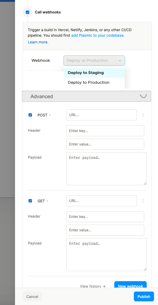 I’d love the ability to have “advanced” and “preconfigured” webhooks. So that if our designers want to publish, they don’t have to understand what the webhook does, they can just select a descriptively named one to take the needed action. (and would default hide the advanced view)