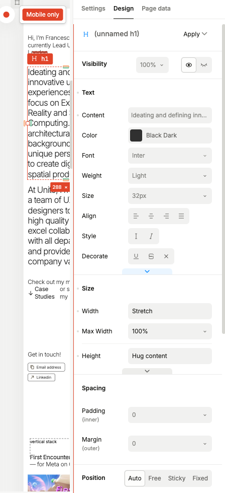I’m trying to fix the alert for Non-CSS overrides in responsive variants. There were 2 alerts regarding ‘H1 element overrides text content in responsive variant Mobile only’, both correctly signalling non-css overrides in the Mobile only version (text copy changes, and stack layout changes.