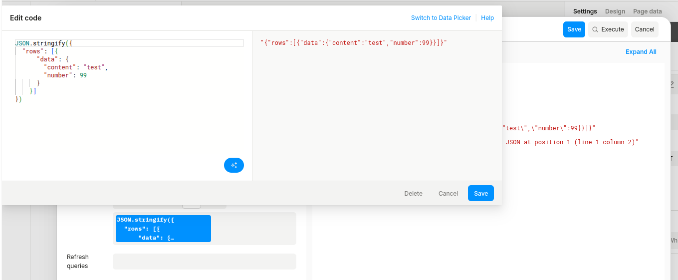 Ok thank you, this finally works, although I don’t quite know why. I guess the stringified json that I copy-pasted has some different syntax that I cannot see.
