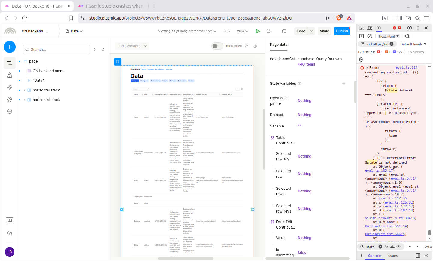 In Plasmic Studio, I select a form (from Ant Design System) that is already set on my page. Selecting it causes Studio to crash. The page starts to reload, but nothing else happens, I have to manually reload the page to come back to Studio. And it happens again.