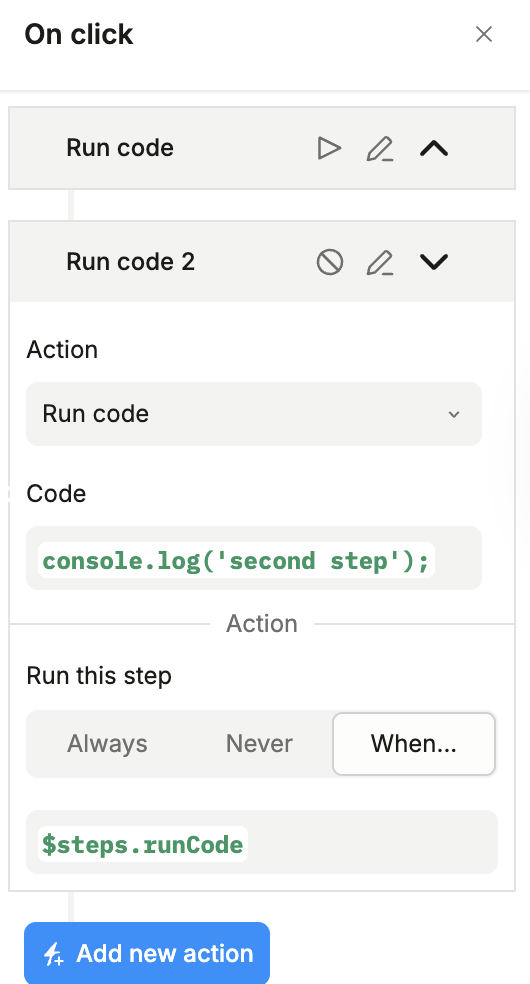Run Code + Default submit + Go to page (the order used in the flow)