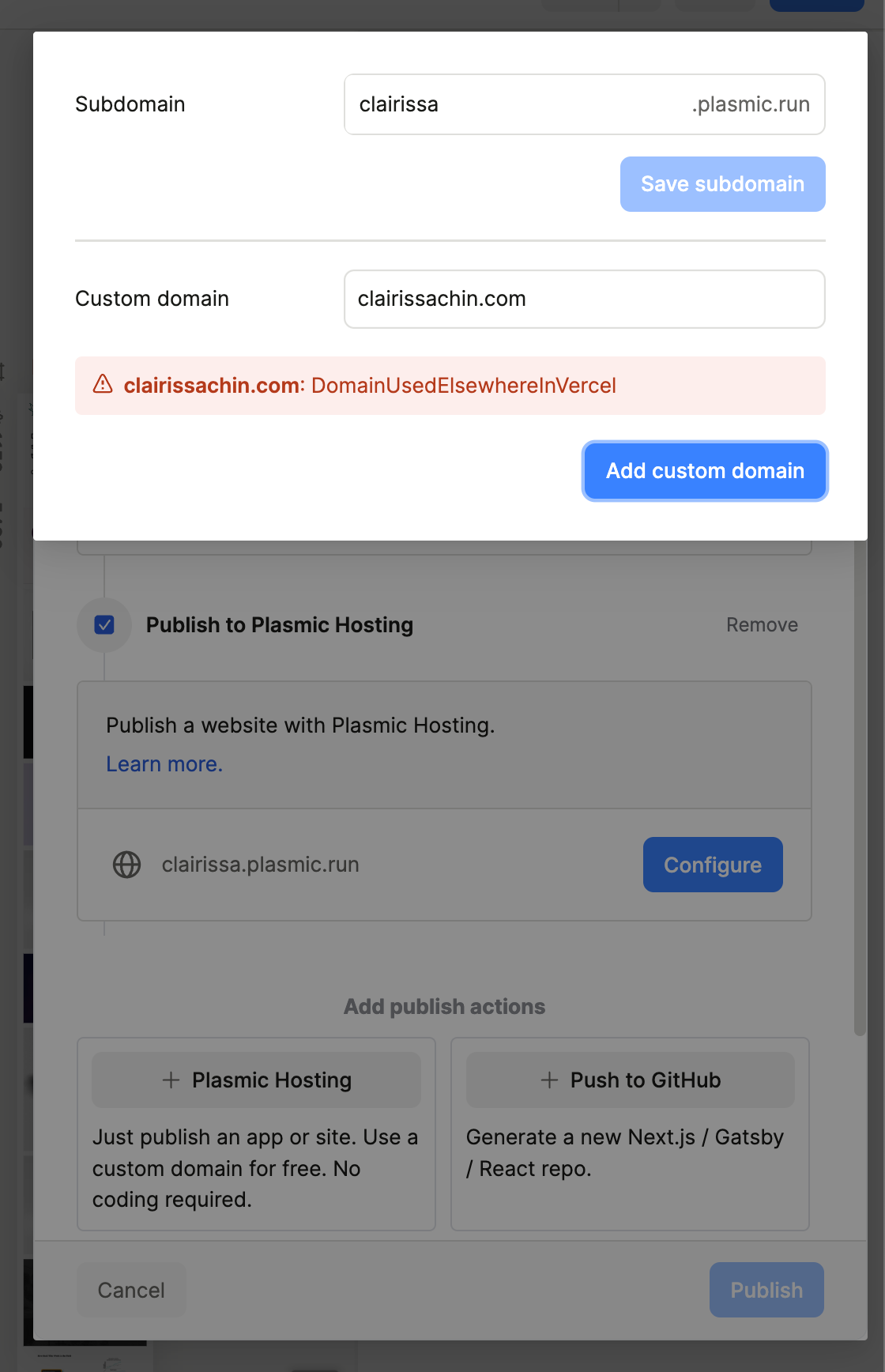 Hi! I tried to publish my site under a custom domain (clairissachin.com), which is managed on GoDaddy. I set up the DNS (2 which were provided on plasmic), but it was only saying one was confirmed, so I restarted–and now I keep getting this error when I try to start publishing again with the same domain on the same project (Plasmic). How would I reattach the domain to try again>