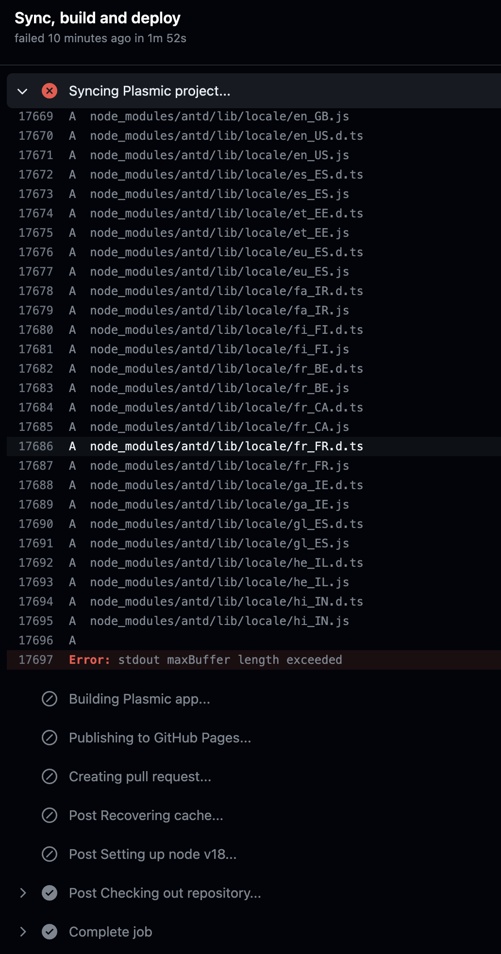 Looking into the GitHub logs, the sync process seems to load tons of node modules leading to a “stdout maxBuffer length exceeded” error.