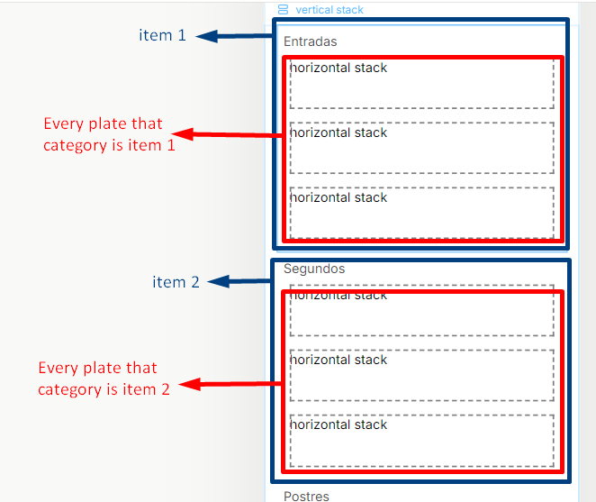 For example, the initial stack is repeated based on a page query of the food category. So it gives me three stacks. Inside every stack, I want to display the information of every category plate. So I tried to make a query for the collection of the second repeat filtering all the plates with the current category, but I don’t have the option of the current category.