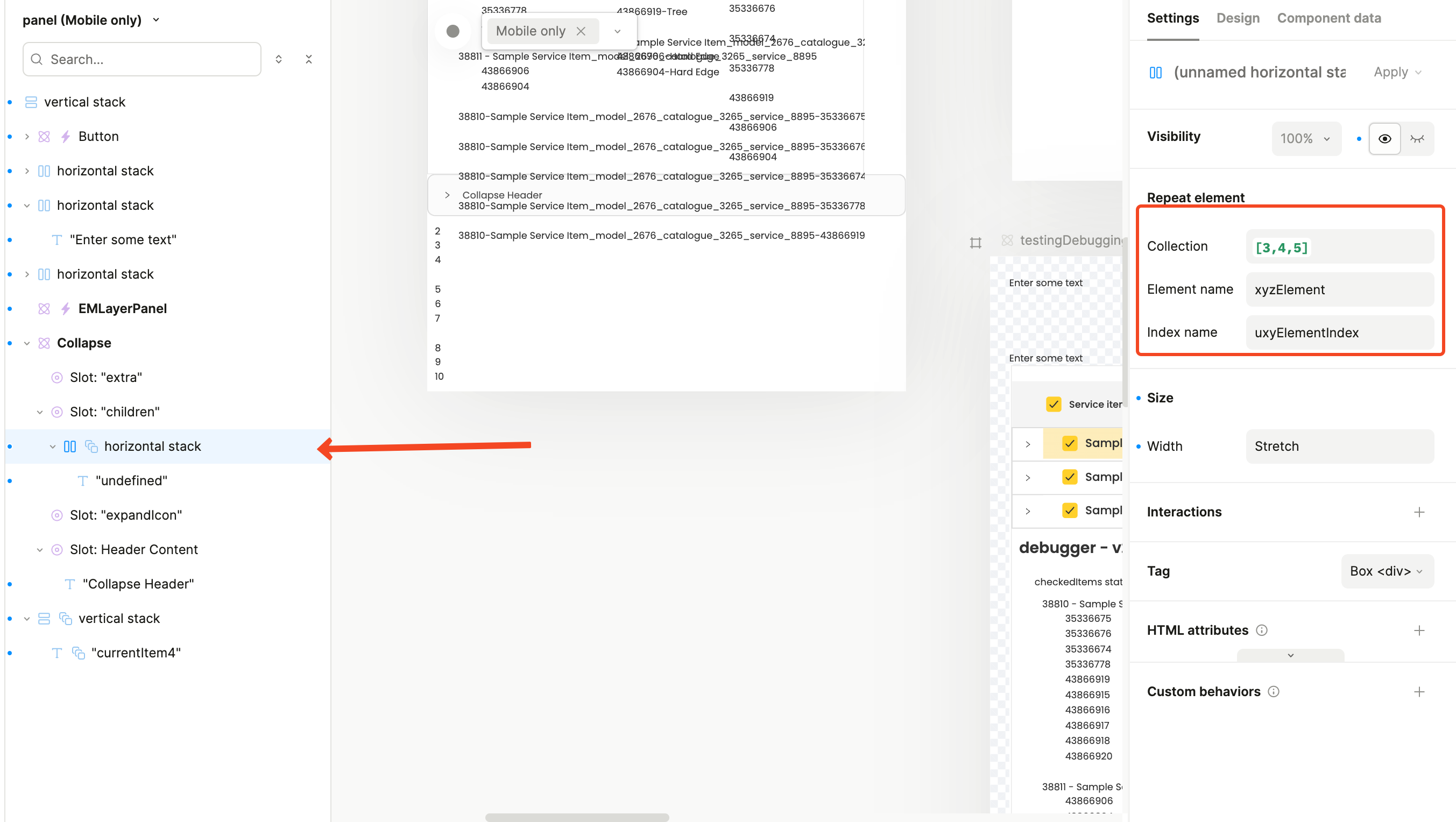 When I try to repeat any element inside a slot and give it an element name and index name, its not available to use in data picker and element name coming up as undefined if references in code mode.