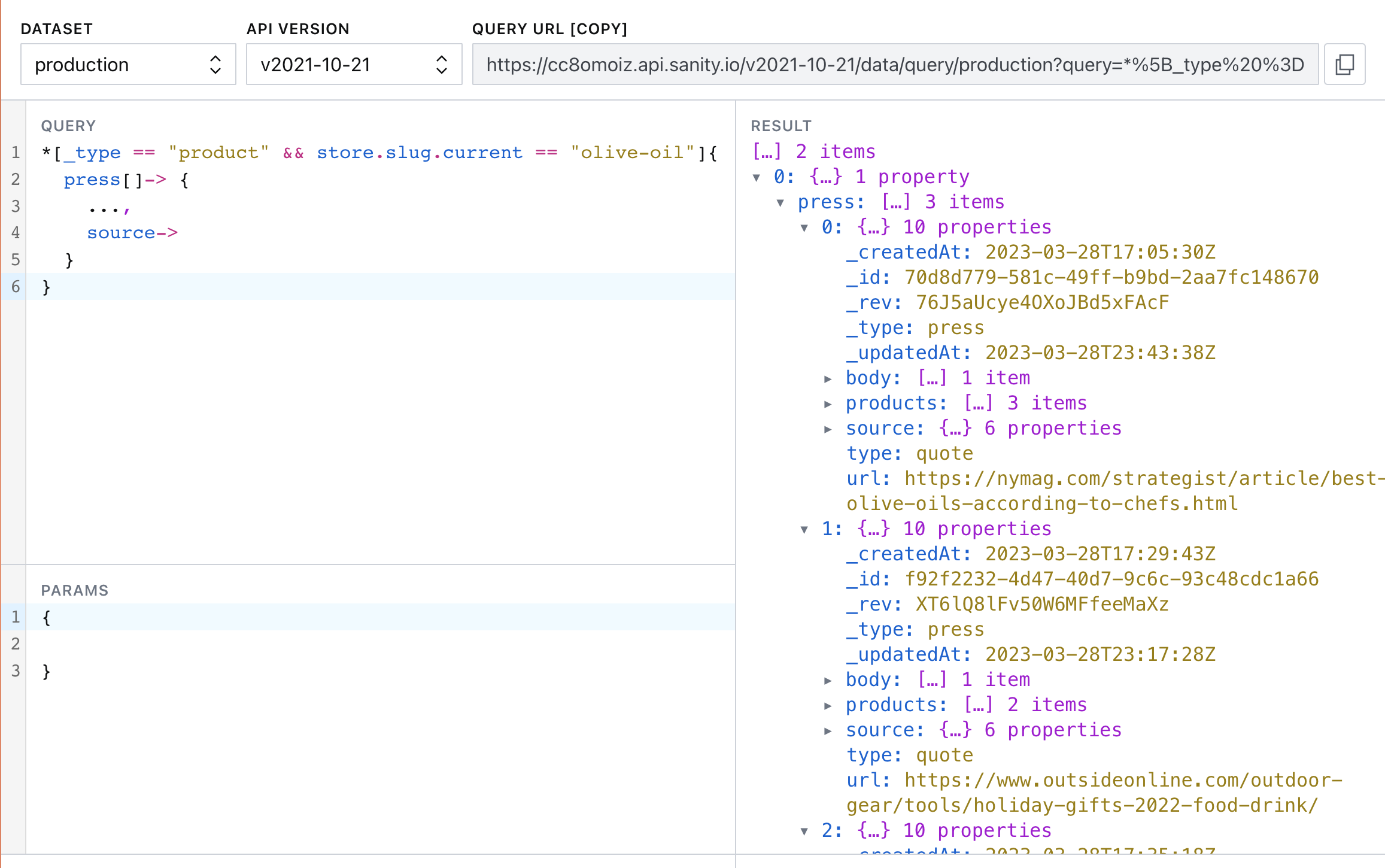 curl '<https://cc8omoiz.apicdn.sanity.io/v1/data/query/production?query=*%5B_type%20%3D%3D%20%22product%22%20%26%26%20store.slug.current%20%3D%3D%20%22olive-oil%22%5D%7B%20%20press%5B%5D-%3E%20%7B%20%20%20%20...%2C%20%20%20%20source-%3E%20%20%7D%7D>' --compressed