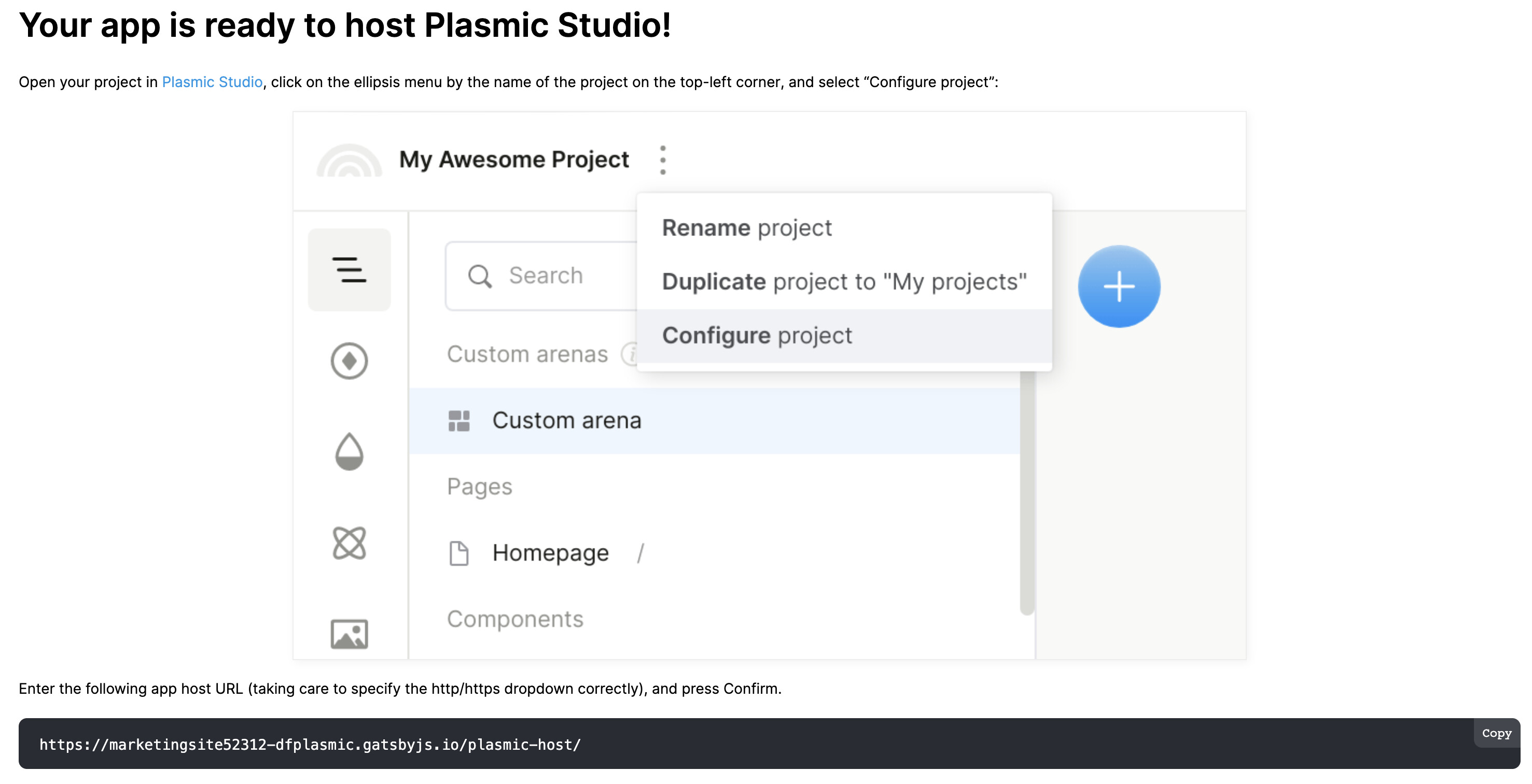 - I added /plasmic-host to my gatsby site following the instructions for existing repos here: https://docs.plasmic.app/learn/app-hosting/#for-existing-repos