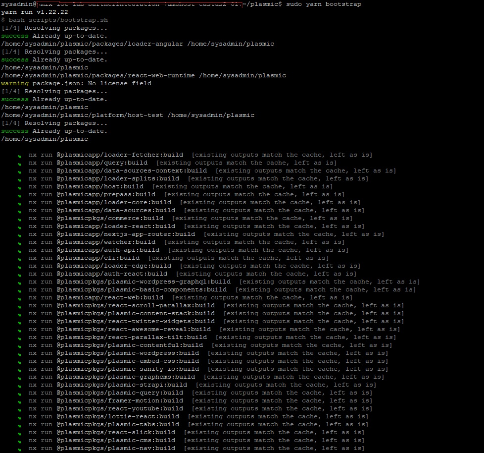 I am able to build the plasmic code using the command “yarn bootstrap”. All 76 applications built successfully.