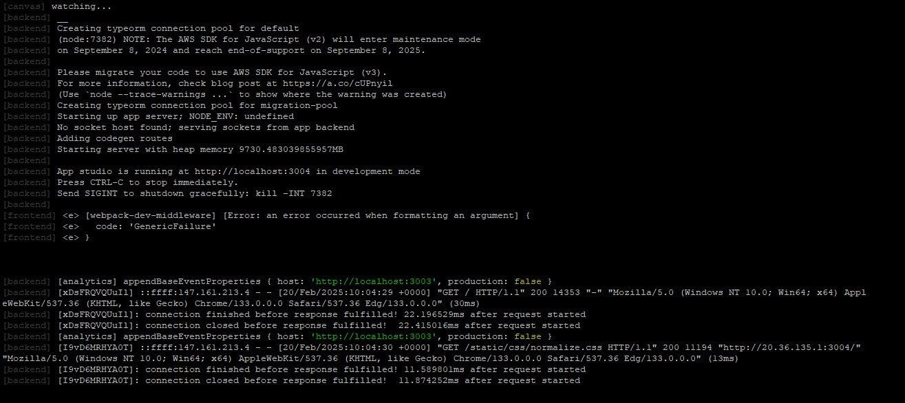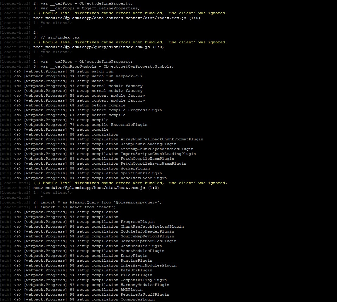 Then I ran the next command to deploy plasmic app. “yarn dev”. On running this command, I see logs saying that appstudio is running in http://localhost:3004. Also, other logs saying that the app can be accessed via its publicUrl: http://localhost:3003. At the of last statement of log message, I got an error message reported in “webpack-dev-middleware” as,