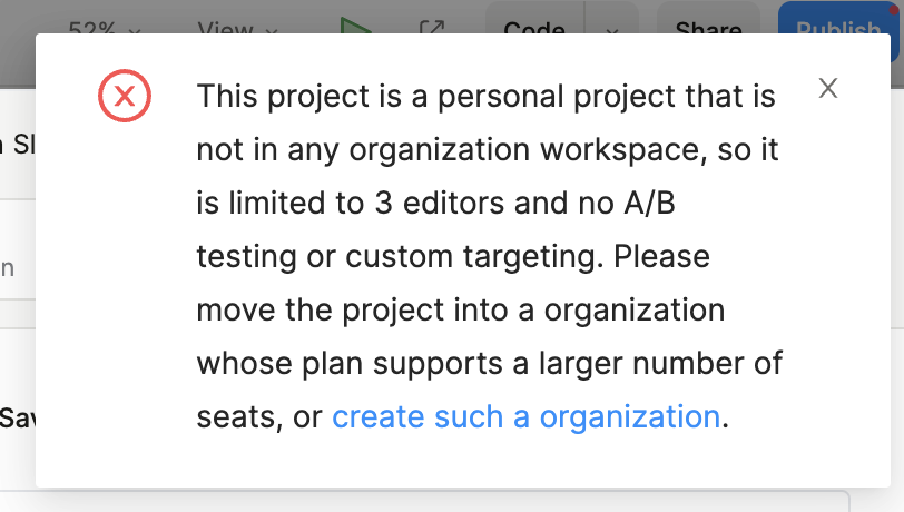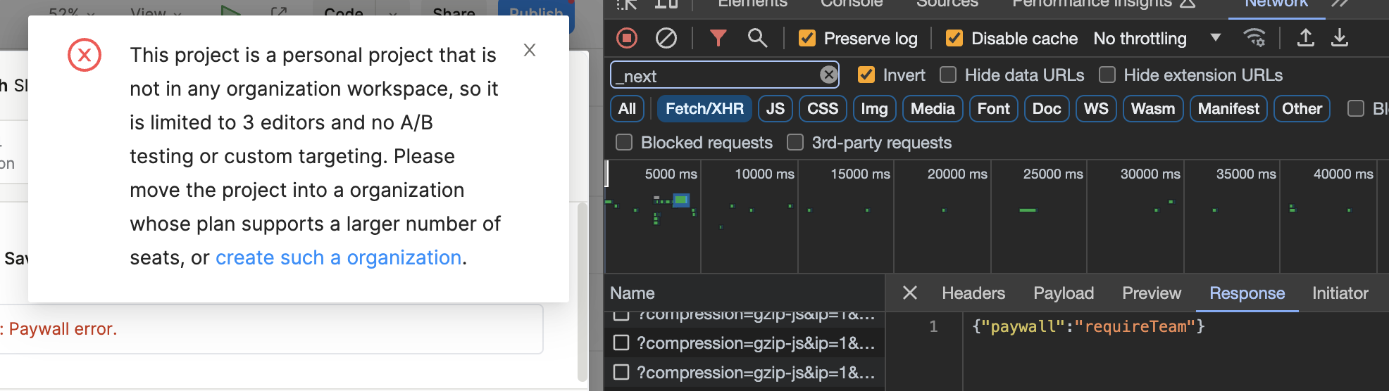 Getting this error on start project, I don’t think I’m even able to set A/B tests nor do I have 3 seats occupied…